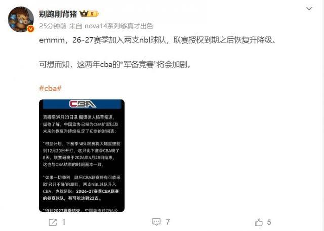 @别跑刚背猪 在个人微博上写道:“emmm,26-27赛季加入两支NBL球队,联赛授权到期之后恢复升降级。