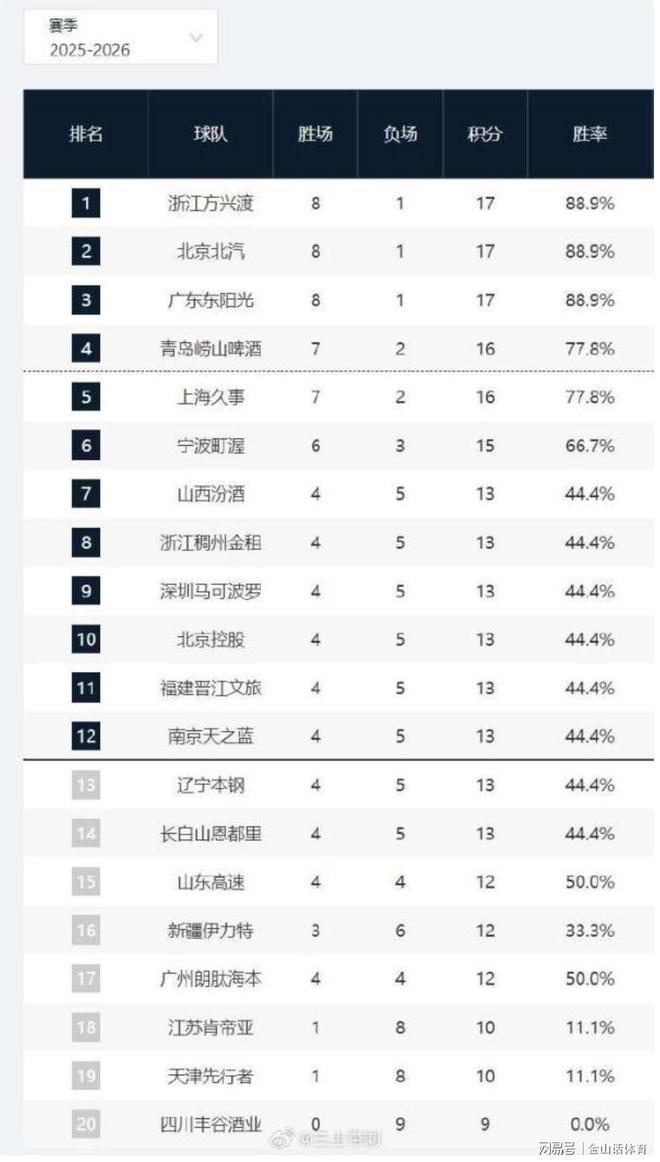 山西汾酒、浙江稠州金租、深圳马可波罗、北京控股、福建晋江文旅、南京天之蓝、辽宁本纲、以及吉林长白山恩都里。以上8支球队,战绩均为4胜5负,分列积分榜第7至14位。