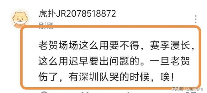 全场打满40分,如此超负荷运转,也让球迷们心疼不已。“把贺希宁当牛一样使啊?打满40分钟。”;“生产队的驴都不带这么用的”;“牛都不敢这样用啊。真牛逼”;“老贺每场都这么用要不得,赛季漫长,这么用迟早要出问题的。一旦老贺伤了,有深圳队哭的时候,唉!”……