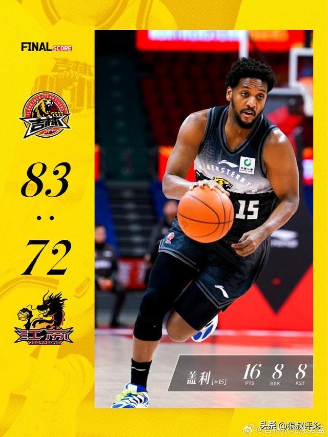 北京时间1月6日,CBA常规赛继续开打,吉林主场83-72江苏,主场豪取5连胜。本场比赛,吉林6人得分上双,盖利得到了16分8篮板8助攻的全面数据,江苏双外援贾尔斯和亨特无法全场比赛保持