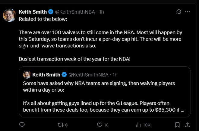 雷速体育10月14日讯 名记Keith Smith更新社交媒体,谈到了为什么NBA球队会在签下球员后一天裁掉他们,并提到了本周将会是NBA最繁忙的交易周,一些非保障合同的球员能否留在球队