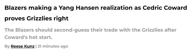 北京时间10月26日,灰熊11号秀考沃德的爆发,让波特兰的一些媒体讨论起杨瀚森来。毕竟,考沃德正是开拓者换来杨瀚森那笔交易的筹码。开拓者队记Reese Kunz点评如下——无论最终结