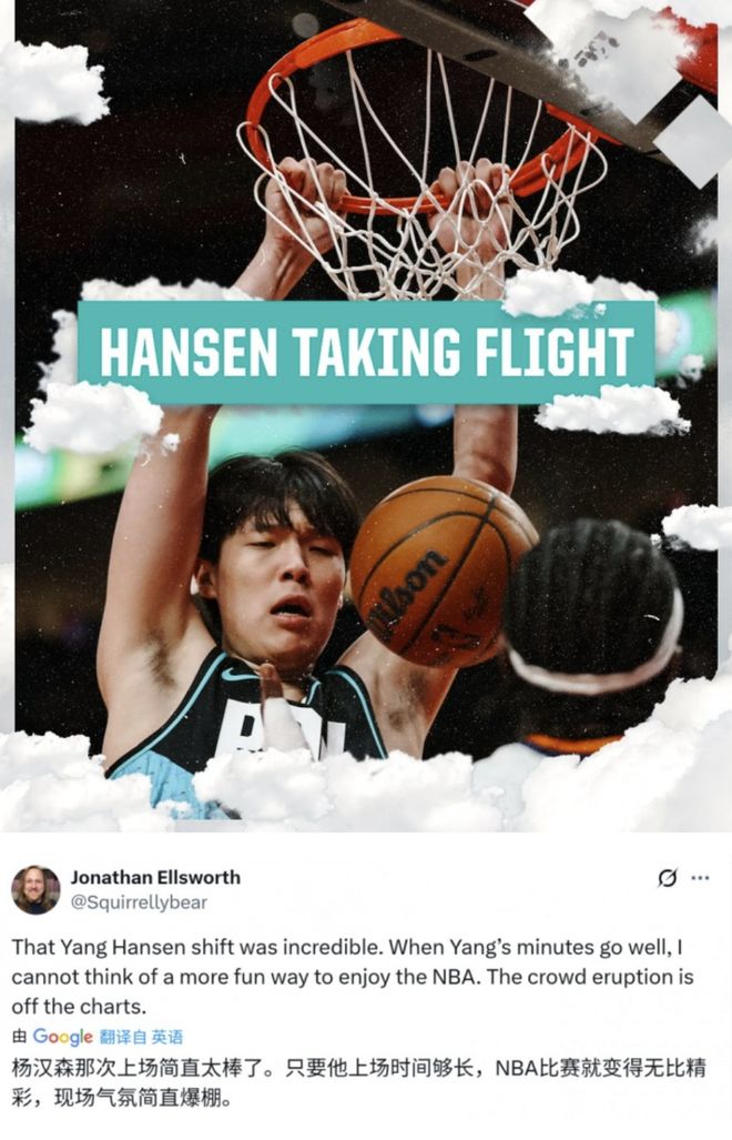 而此时再看看美国网友们对杨瀚森的疯狂称赞,他们已经炸了锅了:“杨瀚森上场之后简直太棒了,他只要上场时间够长,NBA的比赛就会很精彩,现场的气氛就会因他而沸腾。”、“不管其他人怎么说,但是杨瀚森展现出了我想从他身上看到的东西,有亮点和优势,起码他有足够的上场时间了,有进球,有拼抢,有传球意识,还有一些成功之处,最后起码他有天赋。”