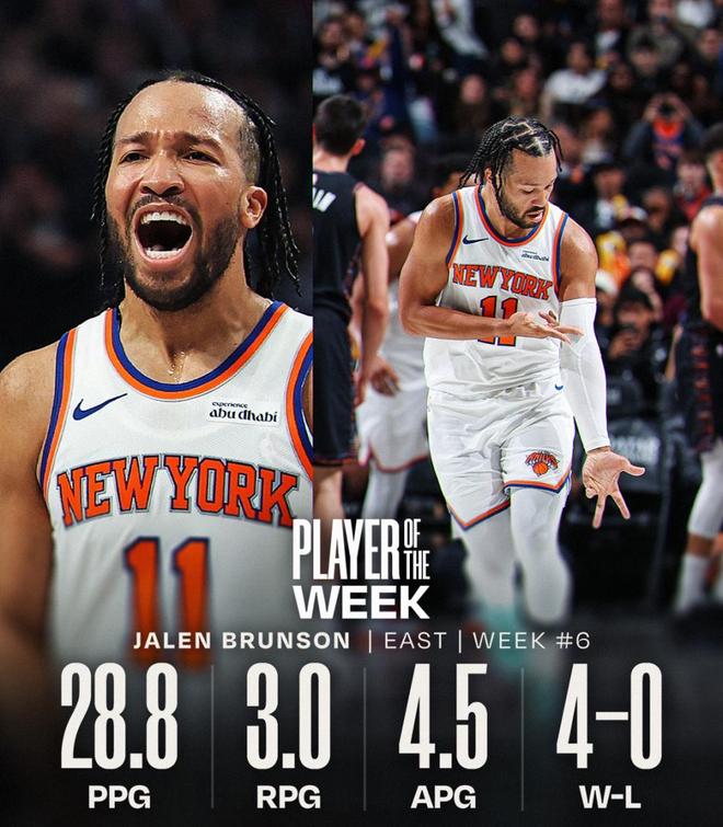 NBA周最佳公布:布伦森率队4战全胜,东契奇场均37.3+8.7+10.3
