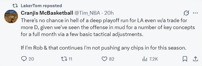 美媒CMB写道:就算LAL交易得到更多防守球员我也不觉得他们能在季后赛中取得成果。因为过去一个月我发现这支湖人不仅是防守差,他们的进攻体系在多个关键方面都出现了严重的问题,而这些问题不是一些基础的战术调整就能改变的,如果我不是佩林卡,这些问题在交易截止日前解决不了,我是不会进行任何交易投入的。