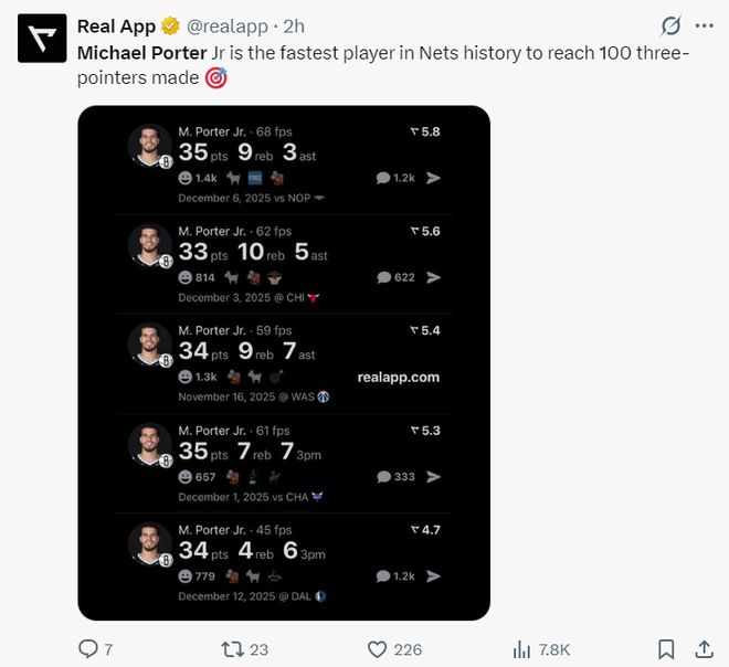 小波特也成为篮网队史最快命中100+三分的球员,目前联盟前四三分命中数+三分命中率40%以上的只有四人:小波特、克努佩尔、穆雷、吉莱斯皮。