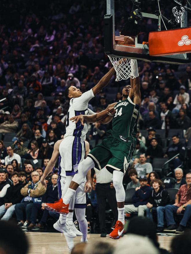 字母哥以76%的极高命中率轰下了全场的最高分,他还是此战走上罚球线次数最多的球员。并且,字母哥还有着85%的罚球命中率。全场没有出手远投的字母哥,在进攻端不断在禁区肆虐,彻底击溃了对手的防线,这也是雄鹿一度取得26分领先的关键。上半场就砍下了15分的字母哥,在下半场持续爆发再得22分。当国王末节将分差缩小至3分之际,字母哥挺身而出,率队重新将分差扩大至19分,就此收下了比赛。