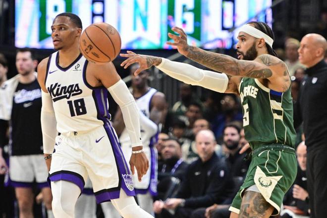 易地再战,威少连续冲击篮下取分,但是字母哥、小波特总是能够在进攻端予以回应,雄鹿继续高举进攻大旗,并一度将分差扩大至26分。拉文、施罗德联手威少追分,进入末节之前,国王落后16分。