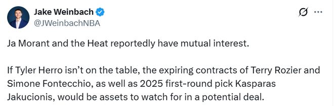 北京时间1月14日,据NBA记者Jake Weinbach报道,据报道,贾-莫兰特与迈阿密热火队双方互有兴趣。若泰勒-希罗不被纳入交易讨论范围,那么罗齐尔和丰泰基奥的到期合同,以及2025年首轮