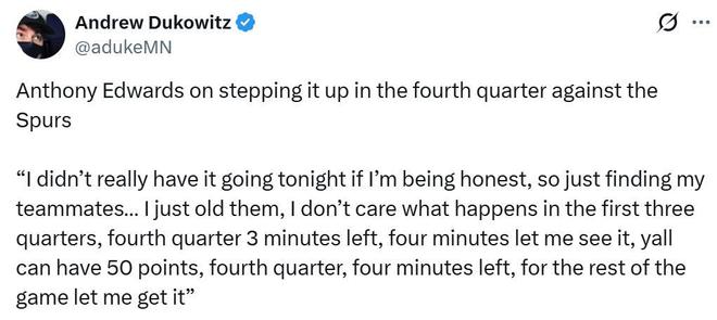 而爱德华兹恰恰是最有可能挑战文班未来10年门面位置的人,在上一场率队完成19分大逆转后,爱德华兹曾公开表示,自己不关心前三节到底发生了什么,只要末节最后3、4分钟分差还在可控范围之内,队友将球交给自己就行了。