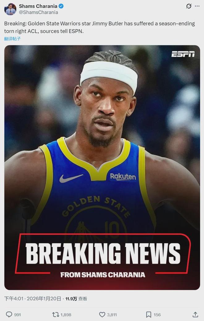 十字韧带撕裂!巴特勒赛季报销!勇士彻底绝望了