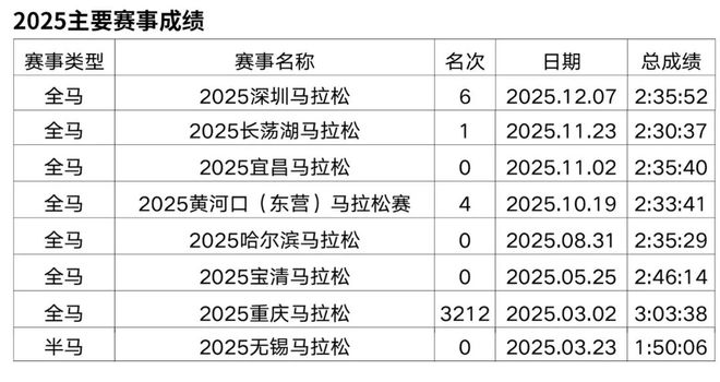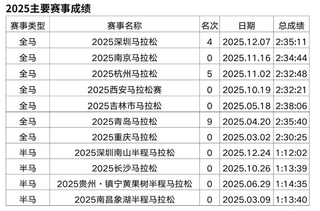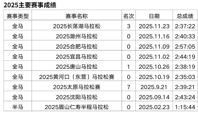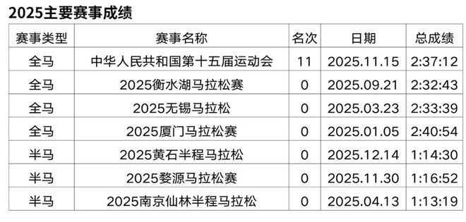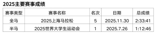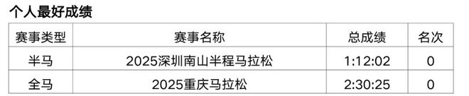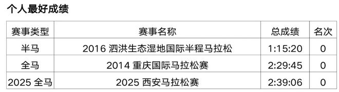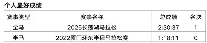 原从事办公室文员工作,2018年开始接触马拉松和越野赛,在此之前无专业队服役经历,高中时期在校练过一年400米专项。2019年首半马143,首全马316,2021年半马117,全马238,全程马拉松达标国家健将等级。