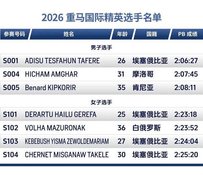 重奖之下,必有勇者。此次重马的参赛阵容颇有来头。国际男选手方面,26岁的阿迪苏·特斯法洪·塔费雷最好成绩是去年在塞维利亚马拉松跑出的2:06:27,他也将成为本届重马破赛会纪录最有力的人选之一;另外两位国际男选手也都在207和208的水平,都有机会夺冠并破赛会纪录。而四位国际女选手的最好成绩都要好于重马国内卫冕冠军丁常琴。