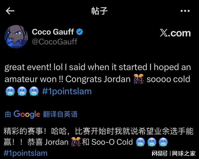 赛后,高芙还在社交媒体上连发两条一球制胜的博文打趣自己的表现,“既然辛纳和蒂亚福都是发球失误出局,那我感觉好受多了!”在赛事落幕后,她又发文表示,“精彩的赛事!一开始我就说,我希望业余球员夺冠!恭喜乔丹,太酷了!”