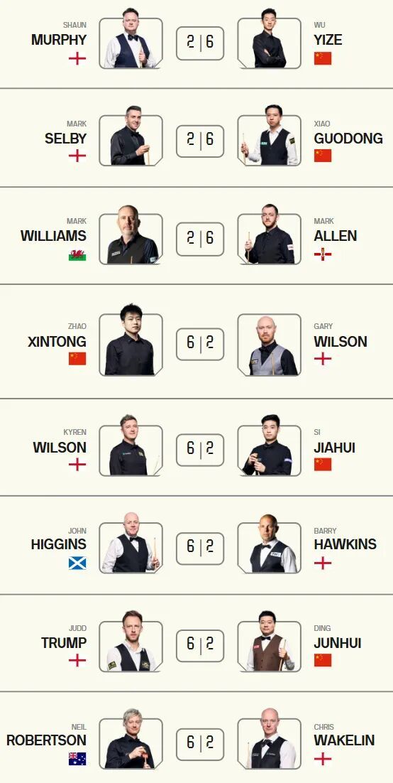 奇怪的默契增加了!斯诺克大师赛首轮比分全是6-2。三名中国选手闯入八强