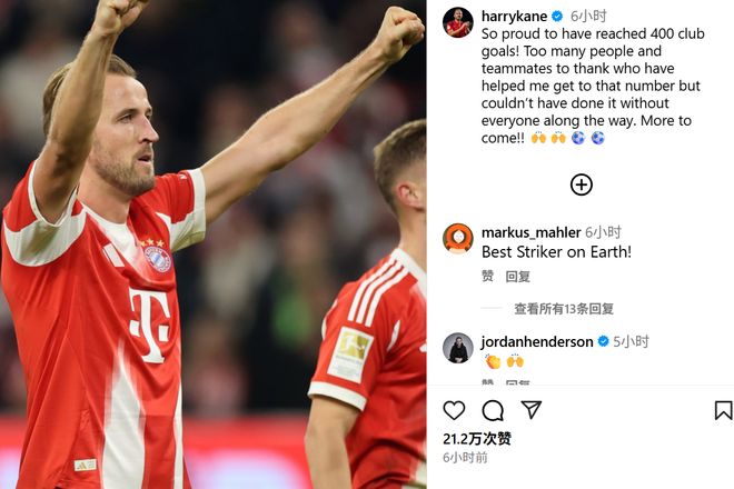 雷速体育10月19日宣 德甲第7轮比赛,拜仁2-1击败多特蒙德,凯恩打入了个人俱乐部生涯的第400球。赛后,凯恩更新个人社媒,谈到了400球的感受。凯恩社媒能达成俱乐部400球,我感到无
