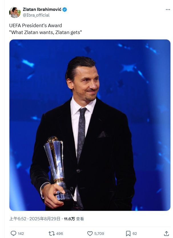 雷速体育8月29日宣 在昨晚的欧冠抽签仪式上,伊布拉希莫维奇获颁2025年欧足联主席奖。伊布社媒再现霸气发言,伊布写道:“兹拉坦想要什么,就能得到什么。”自1998年以来,欧足联每