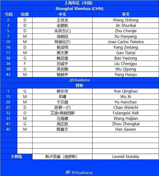 申花客战江原:特谢拉单外援首发,吴启鹏、王世龙、鲍亚雄出战