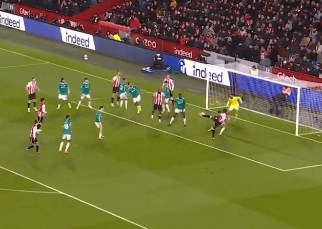 这个进球前发生了一连串混乱的事件。首先萨拉赫在左路对沙德犯规,随后达姆斯高拿到球并迫使马马尔达什维利做出扑救。布伦特福德将球发展到左路,瓦塔拉突破范戴克后被犯规,地点看似在禁区线外。