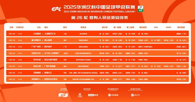 10月11日、12日,2025赛季中甲联赛展开第26轮争夺。赛前,中国足协发布了本轮裁判人员选派安排表。和前几轮一样,本轮涉及冲超、保级的2场关键对决,设置了视频裁判(VAR),分别是:重庆铜