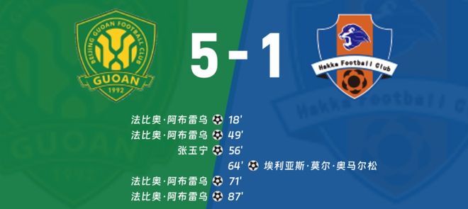 “民声君”无意再度复盘北京国安对阵梅州客家的比赛,上半场,法比奥先后接柏杨和王刚的助攻头槌破门完成“梅开二度”。下半场,张玉宁补射破门,奥马尔松扳回一城;随后法比奥再入两球完成“大四喜”,终获联赛金靴。最终,主场5:1送梅州降级。